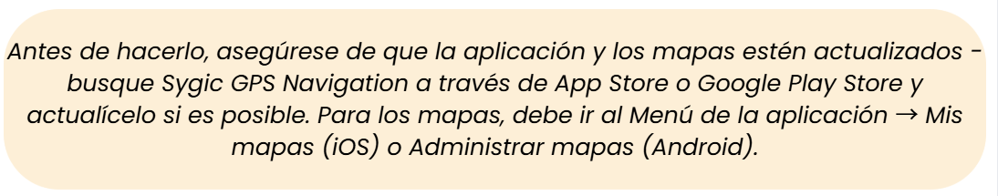 Utilizamos los informes de los usuarios para mejorar continuamente los mapas que usamos en Sygic. Cuantos más detalles envíe, más pronto podremos identificar y reportar el error a nuestros proveedores de datos de mapas.