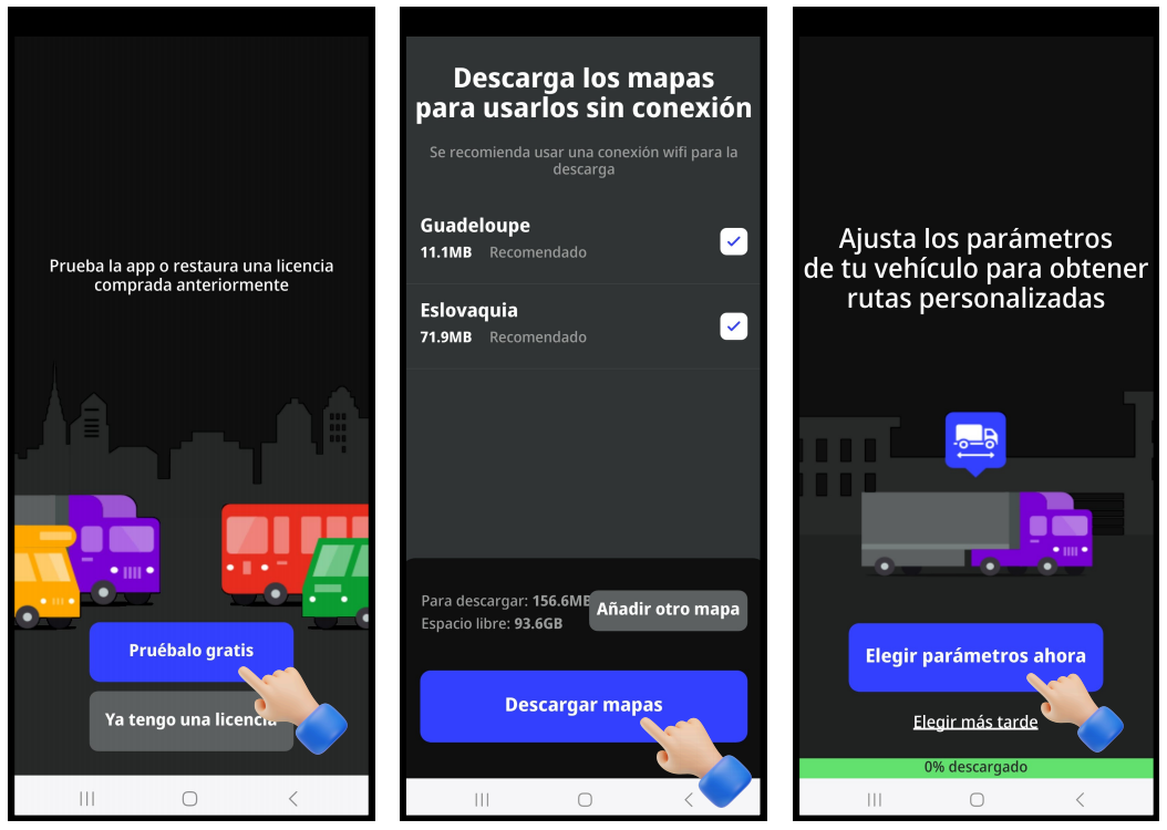 - Puedes establecer los parámetros de tu vehículo mientras esperas la descarga del mapa. La aplicación calculará la ruta de acuerdo con los parámetros del vehículo que seleccionaste.