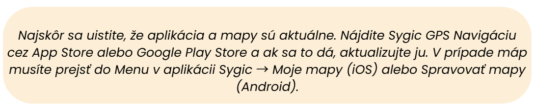 Hlásenia chýb od našich zákazníkov používame na neustále zlepšovanie mápv Sygicu. Čím viac podrobností nám poskytnete, tým skôr budeme schopní identifikovať a nahlásiť chybu našim poskytovateľom mapových dát.
