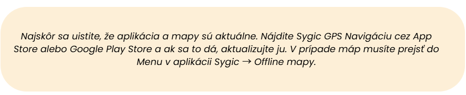 Skúste zmeniť nastavený hlas pre hlasovú navigáciu v menu aplikácie Sygic → Nastavenia → Jazyk a zvuky. Ak máte nastavený ľudský hlas, skúste ho nastaviť na počítačový hlas TTS alebo skúste zmeniť na ľudský hlas, ak máte počítačový hlas TTS. Upozorňujeme, že zmena hlasu môže ovplyvniť zvukové upozornenia, ak ste si ich prispôsobili pre hlas TTS.